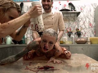 Brittany stretched Sasha's anal hole with a large dildo and covered her anal rose with chocolate sauce, together they licked their dirty roses in the 69 position.